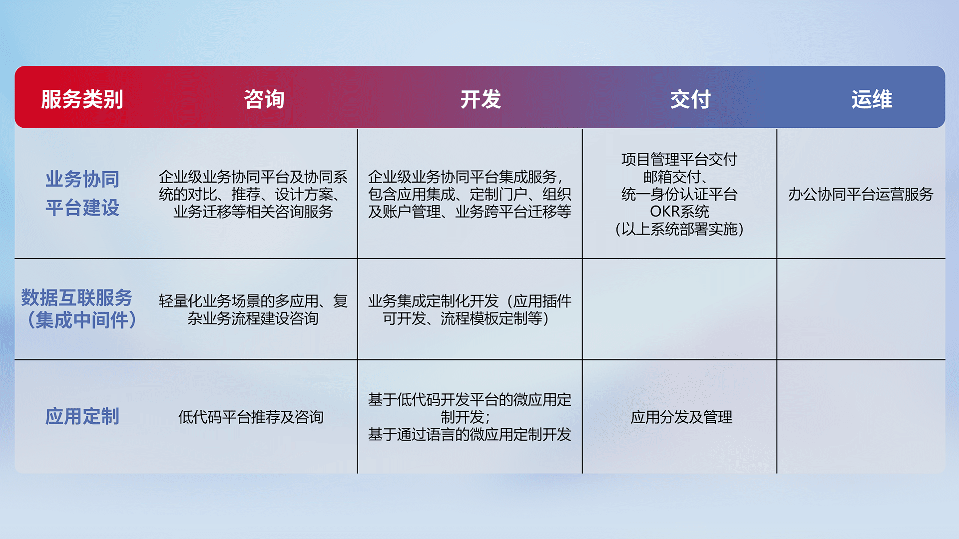 针对钉钉、、、企微、、IDaas等平台级产品提供产品的规划、、、、方案、、交付、、、定制化开发等服务,,,,实现如统一协同办公、、智能客户服务、、混合会议管理、、智能数据查询、、、、等业务场景,,实现数字化转型。。